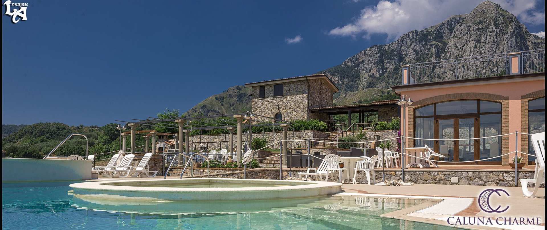 Hotel Caluna Charme has 6 suites and 2 standard double rooms, with minibar, free wifi, private bathroom, air conditioning, phone, TV, and private balcony overlooking the sea in all rooms.The hotel has two dining rooms for your most beautiful events, a large terrace, a solarium and the beautiful pool overlooking the beautiful Gulf of Policastro, from which you can observe the three regions: Campania, Basilicata and Calabria; the pool is equipped with three tanks: one for the children with low water, a main central one and another one where you can relax watching the sea. Around the hotel there are large green spaces and gardens where to go for long walks; parking for your car is free and private.