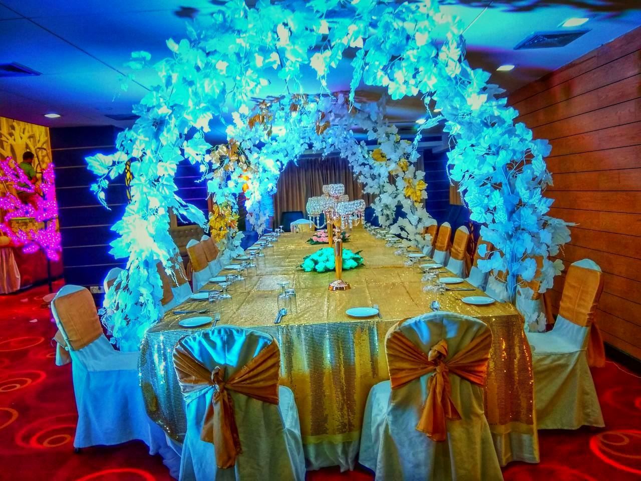 Recently renovated, this grand ballroom has a built-in stage with banner backboard and a greenroom. With side along framed pillars accommodate central open space to allow completely unobstructed view of the stage and plush carpeting, the hall presents one of the most majestic outlooks for all types of upscale celebrations and conferences.